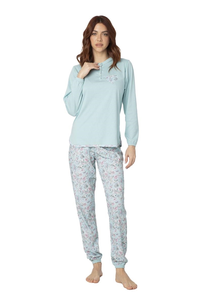 Pigiama Donna in Jersey 100% Cotone Serafino e Applicazione Manica Lunga Pantalone Lungo