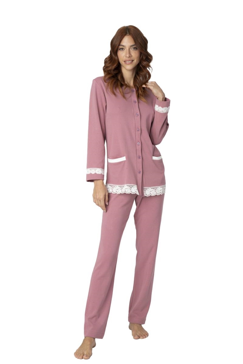 Pigiama Donna in Interlock Smerigliato Aperto con Tasche e Pizzo